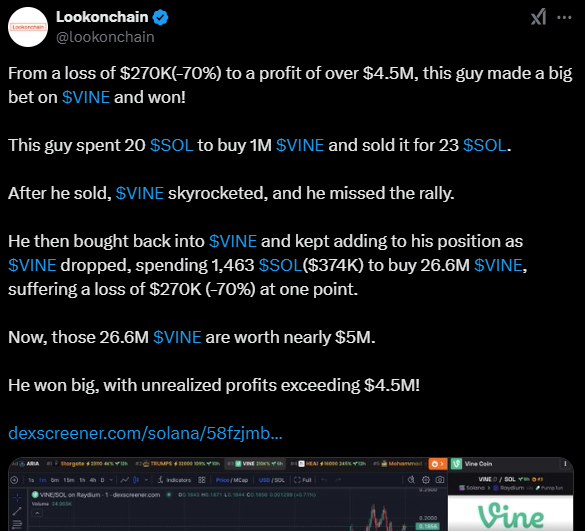 Bununla birlikte, kripto traderı tekrar tokena yatırım yaptı ve hepsine girdi. Bu kez, trader 374 bin dolara eşdeğer 1.463 SOL harcadı ve 26,6 milyon VINE satın aldı, ancak en azından ilk başta işler yolunda gitmedi. VINE meme coin fiyatı düşerek traderı 270 bin dolarlık bir kayba mal oldu. Bununla birlikte, kripto traderı bu kez ısrarcı kaldı ve raporlama zamanına kadar tokeni elinde tutmaya devam etti. Trader artık 5 milyon dolar değerinde Vine meme coin’ine ve 4,5 milyon dolardan fazla gerçekleşmemiş kâra sahip. Böylece, zararı yüksek kâra dönüştürmeyi başardı.