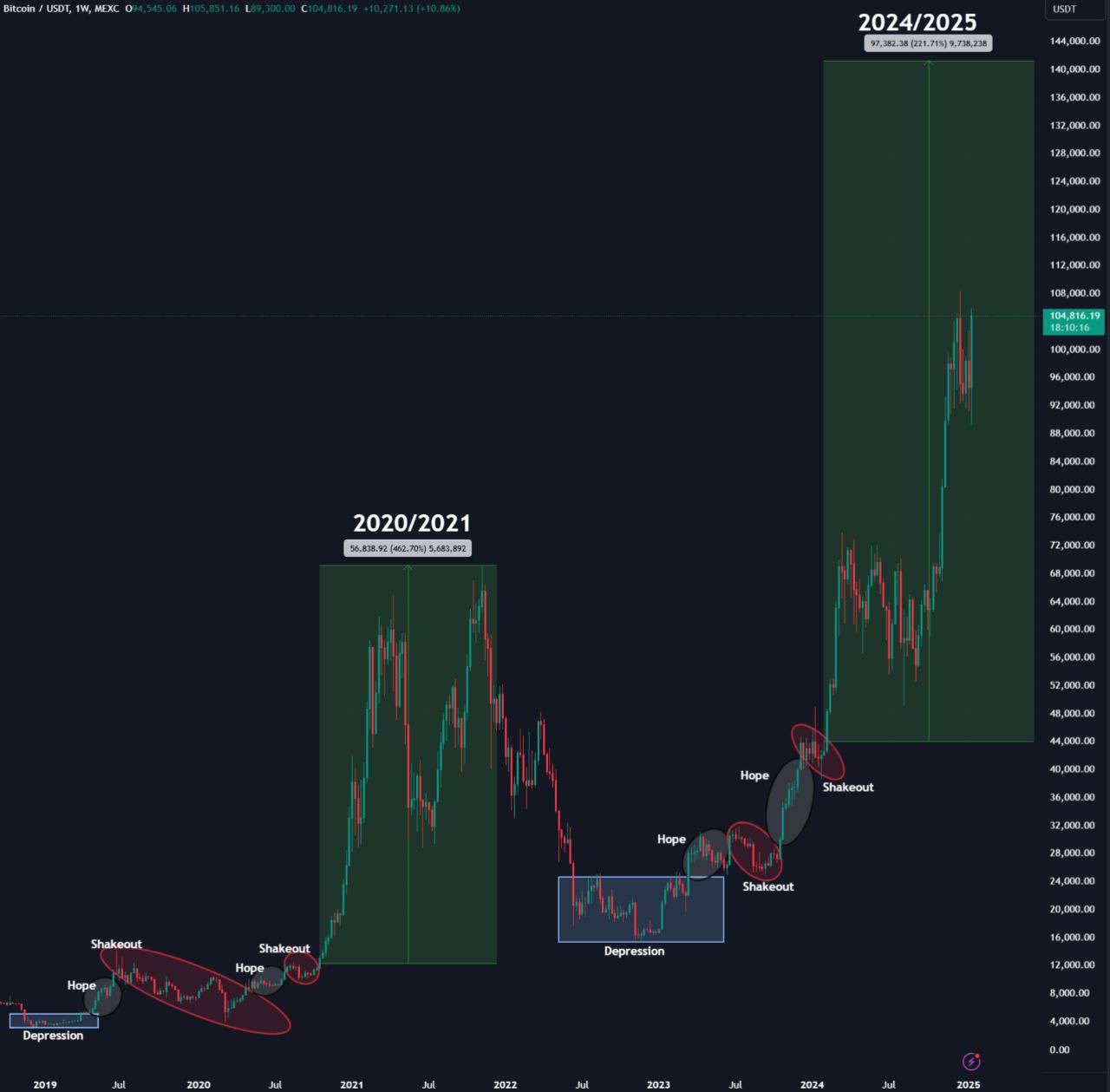 Popüler trader Pentoshi, X’teki son gönderilerinden birinde “$BTC ath çok yakında geliyor bence,” tahmininde bulundu. X’te Eljaboom olarak bilinen kripto tüccarı Moataz Elsayed, Bitcoin’i mevcut fiyat döngüsünün “inanç aşamasına” giriyor olarak tanımladı. X takipçilerine, BTC fiyat hareketini şimdi ve dört yıl önce karşılaştıran bir grafiğin yanı sıra “150 bin dolarlık Bitcoin bu döngüde gerçekleşecek” dedi. Diğer bir trader Daan Crypto Trades yine de haftalık kapanışa girerken önemli bir destek bölgesini tutma ihtiyacını kabul etti. En son piyasa analizinde “BTC, Önceki yılın en yüksek seviyesinin temiz bir şekilde yeniden test edilmesi” ifadesi yer aldı.  Trader, şunları söyledi: