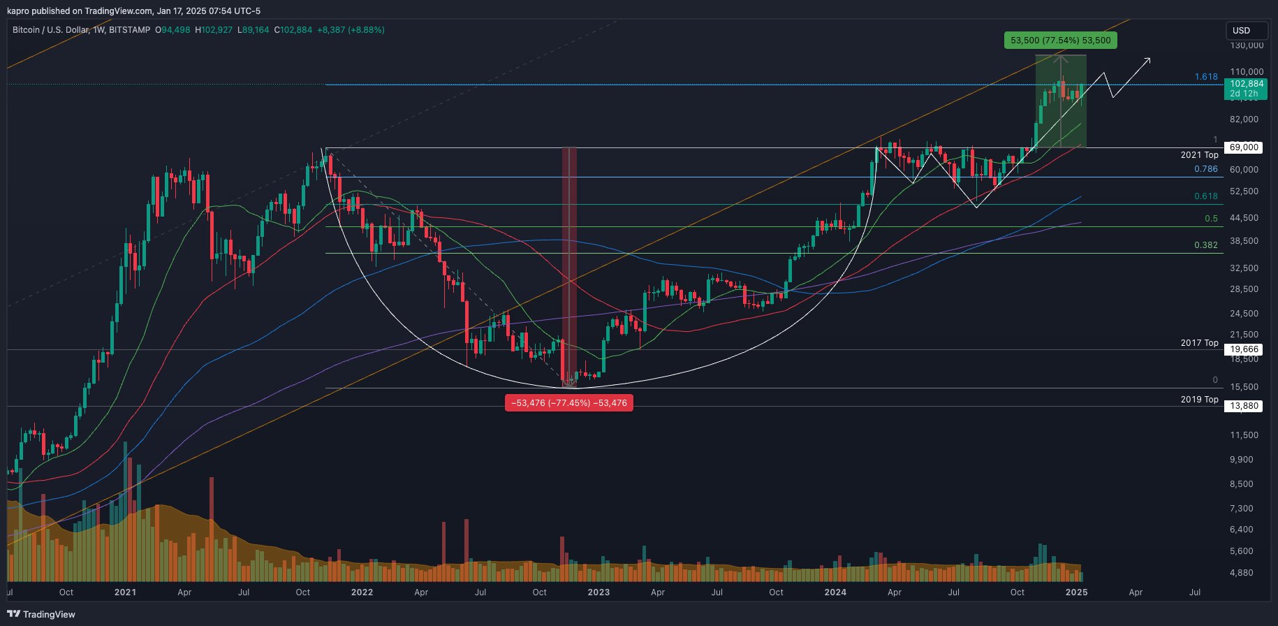 BTC fiyat hedefleri yüksek kalmaya devam ederken, piyasa katılımcıları yalnızca fiyat keşfine doğru bir hareket değil, aynı zamanda kısa vadede %20 veya daha fazla yukarı yönlü bir hareket görüyor. Bunların arasında popüler X yorumcusu Nunya Bizniz de vardı ve bir kırılmaya ihtiyaç duyan yukarı yönlü bir trend çizgisine odaklandı. Grafikte Şubat ayı başı için 122.000 dolarlık bir hedef vurgulanmakta.  Bu rakam,   Material Indicators’ın kurucu ortağı Keith Alan tarafından, Bitcoin haftalık grafiğindeki cup-and-handle formasyonundan kopuşun bir parçası olarak paylaşıldı. Alan, 17 Ocak’ta “Bitcoin temel hareketli ortalamaları geri aldı ve ATH Bölgesine doğru ilerliyor,” diye bildirdi. Alan’a göre, “handle” noktası 122 bin dolarda.