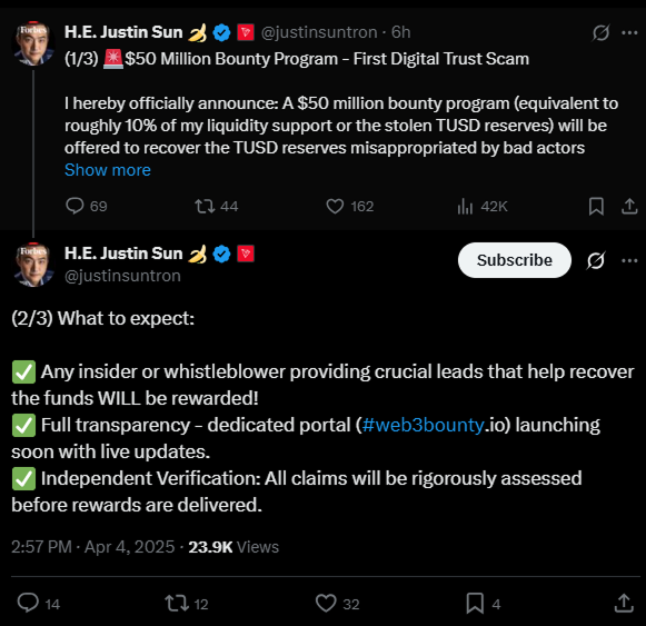 Tron kurucusu Justin Sun’ın 2 Nisan 2025 tarihli First Digital Limited’e yönelik suçlamalarıSun’ın para ödülü hamlesi