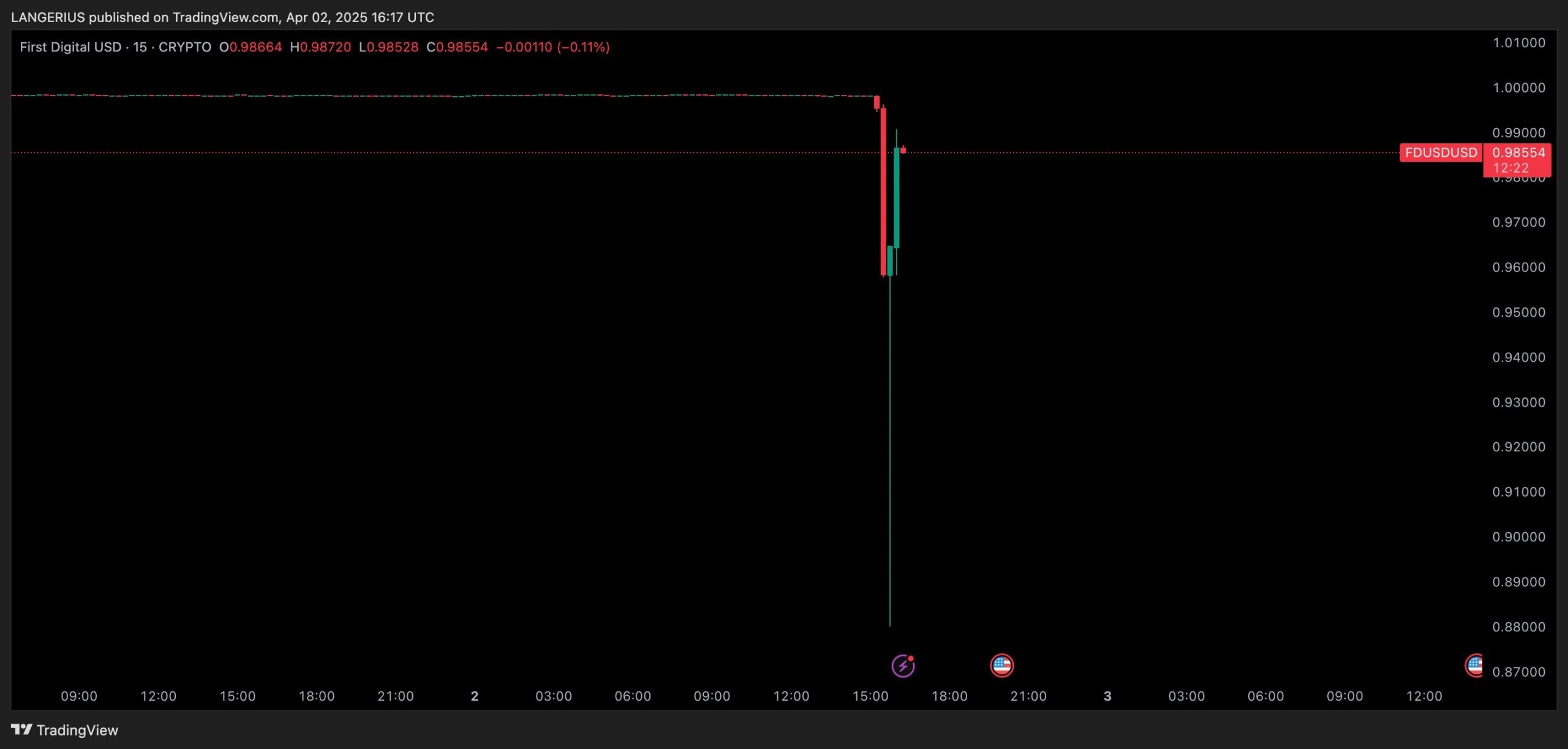 2 Nisan 2025’te FDUSD, dolar sabitliğini kaybederek 0.87 dolara kadar geriledi ve büyük yankı uyandırdı. Tron kurucusu Justin Sun, FDUSD’nin iflas ettiğini iddia ederek yatırımcıları uyardı ve Binance’in bu durumdan haberdar olmasına rağmen sessiz kaldığını öne sürdü.