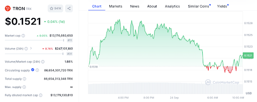 Bu yazı sırasında TRON (TRX) fiyatı 0.152064 dolardan işlem görüyordu. Ayrıca token son 24 saatte 248,194,685 dolarlık işlem hacmine sahipti. Bu arada, TRX son 24 saat içinde yaklaşık 0,1528 dolarlık bir zirve gördü. Ancak, ardından yaklaşık 0,1518 dolara doğru bir düşüş hareketi yaşadı. Bugün sabah 8:00 civarında fiyat toparlanmaya başladı ve 0,1520 dolar civarına yükseldi.