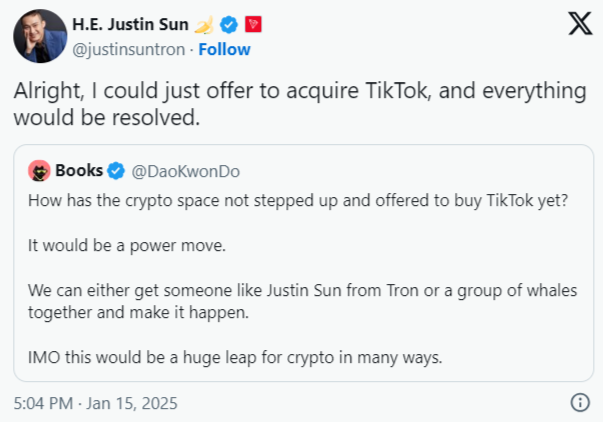 Kullanıcı, “Bu güçlü bir hamle olurdu,” diye tweet attı. Ayrıca, “Ya Tron’dan Justin Sun gibi birini ya da bir grup balinayı bir araya getirip bunu gerçekleştirebiliriz.”dedi. Kullanıcı “bunun birçok açıdan kripto için büyük bir sıçrama olacağına” inanıyor. Bu yorumlara Tron mucidi de sessiz kalamadı. Sun bu tweet’i alıntıladı ve cevap verdi: “Pekala, TikTok’u satın almayı teklif edebilirim ve her şey çözülür.” dedi.