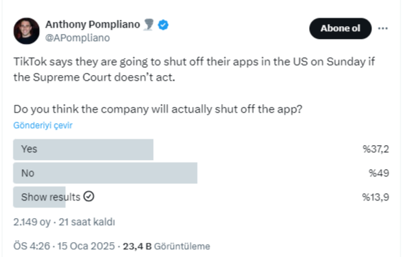 Pompliano (Pomp olarak bilinir), topluluğun hangi seçeneğin gerçekleşme olasılığının en yüksek olduğuna inandıkları konusunda fikirlerini almak için bir X anketi başlattı. Ankete katılanların %49’u TikTok uygulamalarının ABD’de kapatılmayacağına inanırken, %37,2’si bunun gerçekleşeceğine inanıyor. Ankete şu ana kadar 2,000’den biraz fazla kişi oy kullandı.