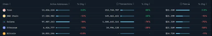 Bitcoin ise daha dengeli bir tablo çizdi. Aktif cüzdan sayısı sadece %0.8 azaldı ve 10.85 milyon seviyesinde kaldı. Ancak işlem ücretlerinde %11’lik düşüş yaşandı ve gelir $14.71 milyon olarak kaydedildi. Bitcoin için bu oranlar hâlâ istikrar göstergesi olarak değerlendirilebilir.