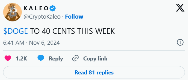 Analistlere göre teknik açıdan, 0,20636 doların üzerine çıkmak daha sürdürülebilir bir yükseliş trendini doğrulayabilir ve muhtemelen DOGE’yi yakın vadede daha fazla kazanç için yola koyabilir. Bu arada, popüler analist Kaleo, DOGE’nin bu hafta 0,40 dolara ulaşabileceğini öne sürerek oldukça iyimser bir senaryo ortaya attı. Kaleo’nun görünümü DOGE’nin spekülatif cazibesini vurgulasa da, bu kadar kısa bir sürede mevcut fiyatı ikiye katlamak benzeri görülmemiş bir satın alma baskısı gerektireceğinden, bu iddialı bir hedef.