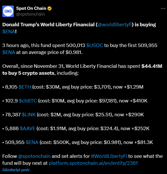 Spot On Chain bazı ilginç haberler bildirdi. Donald Trump’ın işleriyle bağları olan World Liberty Financial, bir grup ENA satın aldı. Yaklaşık 500.013 dolar (token başına yaklaşık 0,981 dolar) harcayarak 509.955 token aldılar. Bu da tek seferlik bir şey değil. Kriptokoin.com olarak da bildirdiğimiz üzere, Ethereum, Chainlink ve Aave gibi farklı coinlere 44,41 milyon dolar yatırdı. Ethena’nın kurumsal desteği, trader ve yatırımcılar arasındaki güveni artırdı. 31 Kasım’dan bu yana World Liberty Financial’ın yatırımları, token için yükselen bir yörüngeye katkıda bulunarak büyüme potansiyeline güvenilirlik kattı.