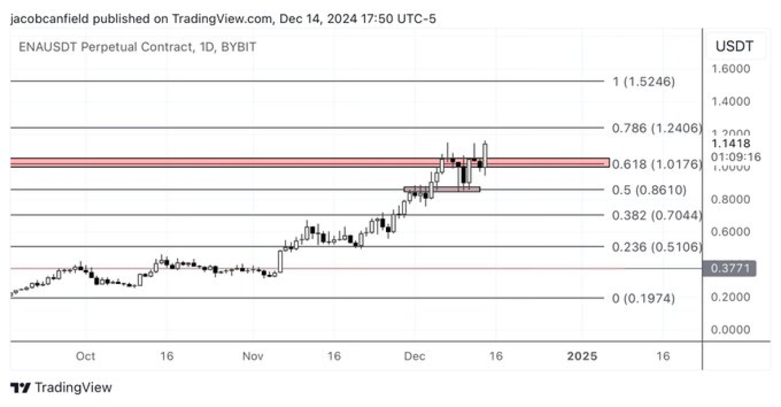 Bu alımların haberi, ENA’nın fiyat grafiğinde görüldüğü gibi önemli bir direnç bölgesinden kopuşuyla aynı zamana denk geliyor. Analistlere göre, ENA fiyat grafiği, Ekim’den Aralık’a kadar sürekli olarak daha yüksek en yüksek ve daha yüksek en düşük seviyelerle güçlü bir yükseliş eğilimi gösteriyor. Ancak, fiyat son zamanlarda bir konsolidasyon aşamasına girdi ve 1,0176 ile 1,1418 dolar arasındaki direnç seviyelerini test etti. 1,0176 dolardaki 0,618 Fibonacci seviyesi önemli bir destek bölgesi olarak ortaya çıktı ve token bu seviyenin üzerinde direnç gösterdi.
