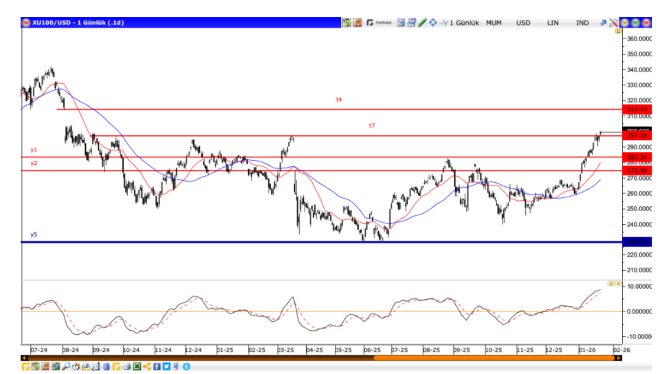 Yukarıda dolar bazlı Borsa BIST100 grafiği var. Gördüğünüz gibi 297$ direncinin üzerinde kapandık. Bu seviyenin üzerinde kalmayı başardığı taktirde güçlenebilir ve sonraki hedef 314$ seviyesi. teknik olarak görünüm güçlü. Mesela Taktik anlamda 297$ seviyesi üzerinde kaldığı sürece pozisyonu koru demek mümkün. Yeni alım yapacaksan 297$ stop loss al demek mümkün.