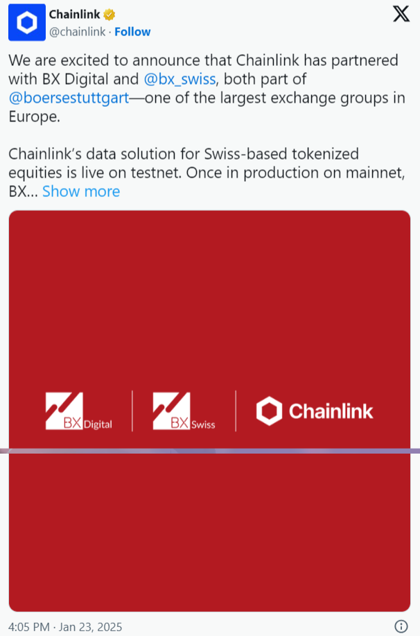 Chainlink, tokenize hisse senetleri için on-chain piyasa verileri sunmayı öngören BX Digital ve BX Swiss ile işbirliğini duyurdu. Altcoin, X gönderisinde, “Chainlink’in, her ikisi de Avrupa’nın en büyük borsa gruplarından biri olan Boerse Stuttgart’ın bir parçası olan BX Digital ve BX Swiss ile ortaklık kurduğunu duyurmaktan heyecan duyuyoruz” açıklamasını yaptı.