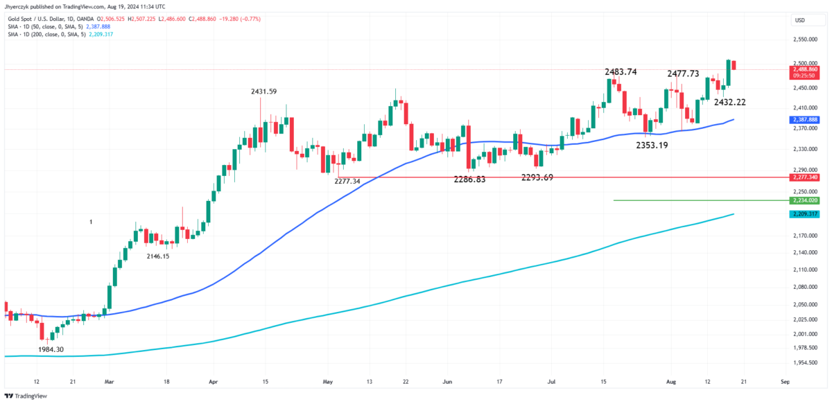 Kriptokoin.com’dan takip ettiğiniz üzere, altın fiyatları bir önceki seansta 2.500 doların üzerine çıktı. Ancak, sarı metal tüm zamanların en yüksek seviyesine ulaştıktan sonra hafifçe geriledi. Bu yükselişte güçlü güvenli liman talebi ve ABD’nin faiz oranlarını yakında düşüreceğine dair artan beklentiler etkili oldu. Yatırımcılar şimdi Fed’in bir sonraki hamlelerini bekliyor. Özellikle de Başkan Jerome Powell’ın Cuma günü Jackson Hole sempozyumunda yapacağı konuşmayı yakından izliyor.