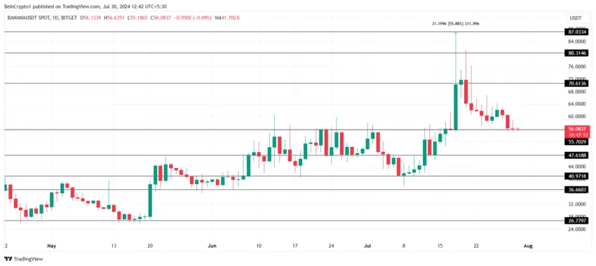 Banana Gun (BANANA) fiyatı son iki haftada %21 düşüşle 72 dolardan 56 dolara geriledi. Bu arada, son iki günde Telegram kripto parası kritik destek seviyesi olan 55 doların üzerinde kaldı. Bu seviye Haziran ve Temmuz ayları boyunca birçok kez direnç seviyesi olarak test edildi ve şimdi bir destek olarak test ediliyor. Önümüzdeki günlerde birikim başlarsa, bu destekten bir geri dönüş BANANA’yı 65 dolarlık psikolojik dirence gönderebilir.