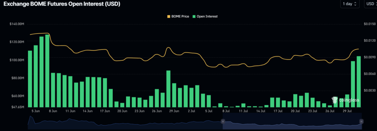 BOME/USDT günlük grafikCoinGlass’tan alınan veriler, borsalarda BOME’de geleceğin Açık Faizinin (OI) arttığını gösteriyor. Aşağıdaki grafik, BOME’nin OI’sinin Cumartesi günü 61,88 milyon dolardan Pazartesi günü 104,80 milyon dolara yükseldiğini ortaya koyuyor. Bu da piyasaya yeni veya ek paranın girdiğini ve yeni alımların gerçekleştiğini işaret ediyor