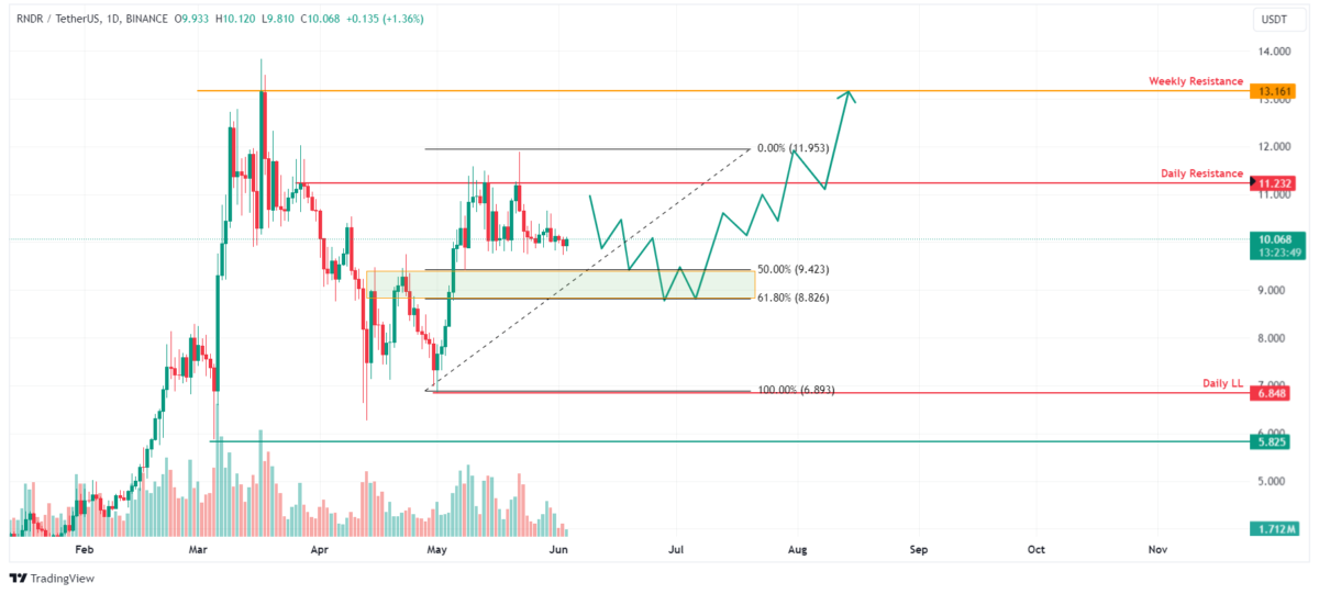 Render fiyatı şu anda 11,23 dolar günlük direnç seviyesi tarafından ret görüyor. Bu direnci kırmak için birçok kez girişim yaptı. Ancak bunu başaramadı. Bu yüzden, RNDR’nin daha fazla geri çekilmesi de mümkün. Alım fırsatı arayan yatırımcılar, 22 Mayıs’taki 11,95 dolarlık en yüksek seviyeden 1 Mayıs’taki 6,84 dolarlık en düşük seviyeye çekilen sırasıyla %50 ve %61,8’lik Fibonacci düzeltme seviyeleriyle aynı hizada olan 9,42 dolar ve 8,82 dolara kadar uzanan bölgede bunu yapabilirler.