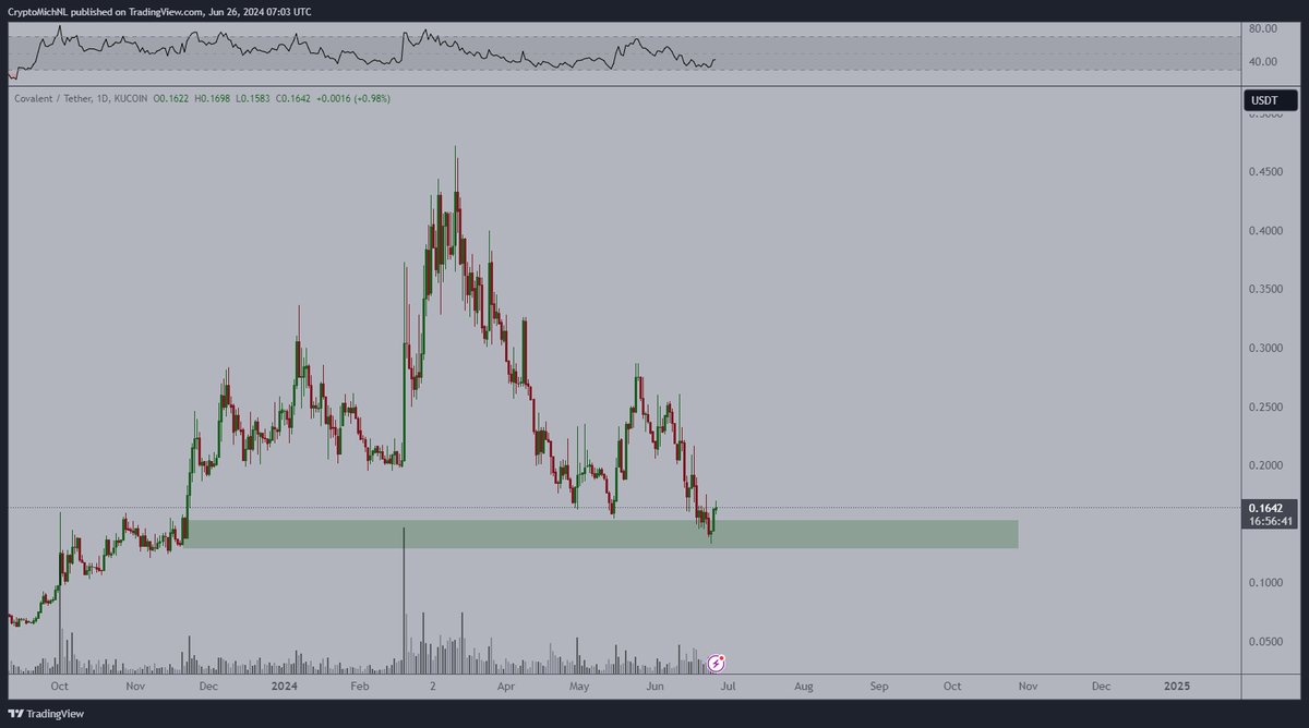 Piyasada oldukça geniş bir takipçi kitlesine sahip olan Michaël van de Poppe, düşük hacimli bir yapay zeka (AI) tokeninin yükselişe geçmeye hazır olduğunu söylüyor. Bu bağlamda Michaël van de Poppe, piyasa değerine göre 346. en büyük kripto olan Covalent’in (CQT) yükselmeye hazır olduğunu belirtiyor. Bu doğrultuda analist, “CQT şu anda Kasım 2023 seviyelerine geri döndü. Şubat ayındaki zirveden bu yana sert bir düzeltme. Son yeni güncellemelerinden bu yana Covalent’in fiyatının önemli ölçüde yükseldiğini görmeyi bekliyoruz.” diyor.