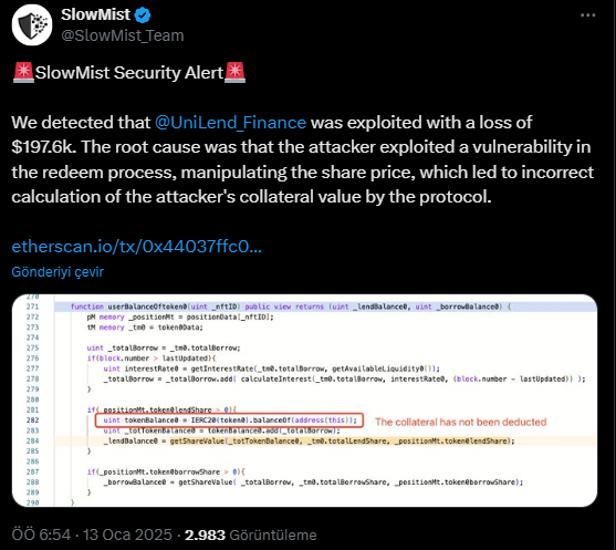 Kripto para platformu UniLend, SlowMist’in sosyal medya üzerinden yaptığı açıklamaya göre, 197.600 dolarlık bir kayba yol açan bir güvenlik ihlali yaşadı. Saldırının temel nedeni, saldırganın itfa sürecindeki bir güvenlik açığını kullanarak hisse senedi fiyatını manipüle etmesi ve bunun sonucunda protokolün saldırganın teminatının değerini yanlış hesaplamasıydı.