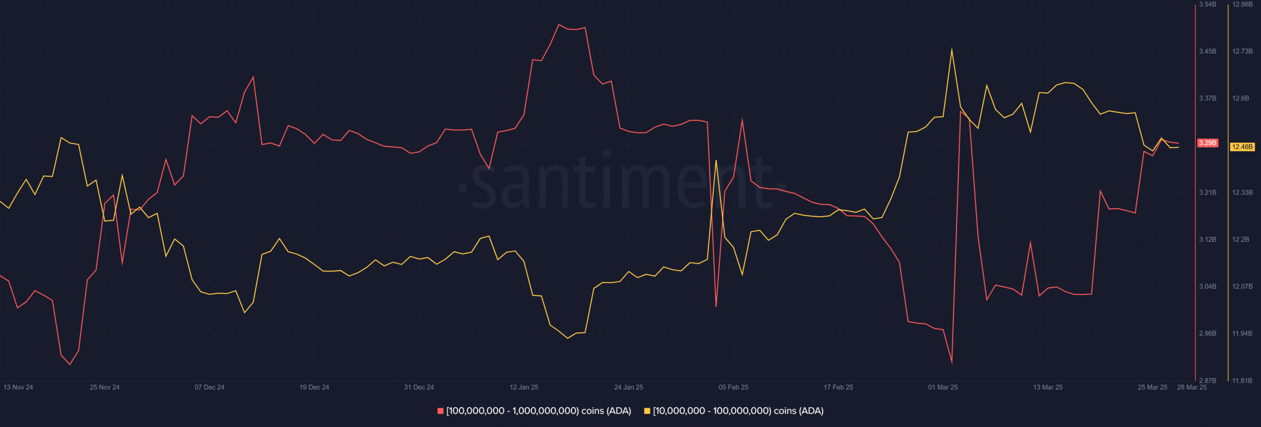Zincir üstü verilere göre, en etkili ADA balinaları 10 milyon ila 100 milyon ADA arasında tutan yatırımcılardan oluşuyor. Bu grup, toplamda 12.46 milyar ADA’ya sahip. Ancak Mart ayı içinde bu balinaların elindeki ADA sayısı 12.74 milyardan 12.46 milyara geriledi.