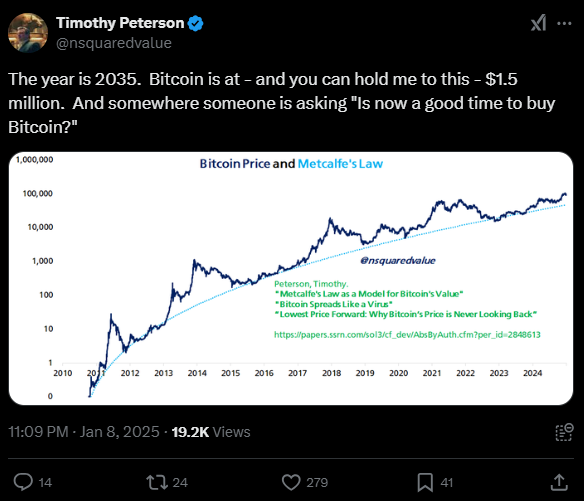Timothy Peterson, Bitcoin’in geleceği için oldukça iyimser bir fiyat tahminine yer verdi. Bitcoin ağının büyümesini temel alarak, 2035 yılına kadar BTC’nin değerinin 1.5 milyon dolara yükseleceğini öngördü. 8 Ocak’ta yaptığı X paylaşımında, Bitcoin’in 1.5 milyon dolar seviyesine ulaşacağının altını çizdi. Bu tahmini “10 yıl içinde, yani 2035 yılı itibariyle, Bitcoin 1.5 milyon dolara ulaşacak. Siz bana güvenebilirsiniz. Bunun olacağını söyleyebilirim” şeklinde belirtti.