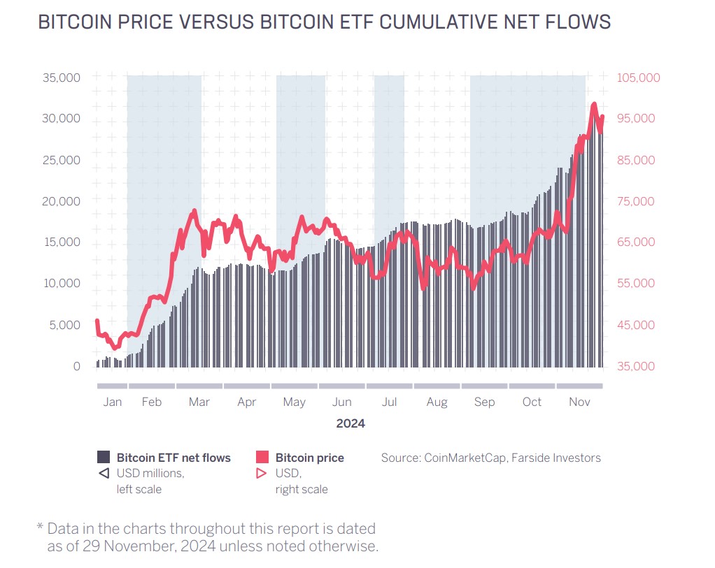 21 Kasım’da ABD Bitcoin ETF’leri ilk kez net varlık olarak 100 milyar doları aştı. Bitcoin, spot BTC ETF’lerinin Ocak ayında piyasaya sürülmesinden bu yana ETF ortamına hakim oldu. Yatırımcı ilgisi, kripto dostu Başkan seçilen Donald Trump’ın 5 Kasım’da ABD seçimlerinde galip gelmesinin ardından hızlanmakta. Morningstar pasif stratejiler araştırma direktörü Bryan Armour, şunları söylemişti: