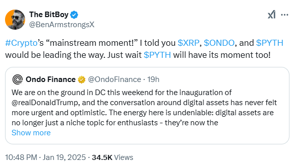 Kriptokoin.com’dan takip ettiğiniz üzere, kripto varlık piyasası artık niş tartışmalarla sınırlı değil. Çünkü, politika yapıcılar, iş liderleri ve hükümet yetkilileri için önemli bir odak noktası haline geldi. Hafta sonu Donald Trump’ın Washington’daki yemin töreni sırasında, Blockchain teknolojisi ve kripto paraları çevreleyen atmosfer özellikle acil ve iyimser hissedildi. Artık nişten ana akıma geçiş, dijital varlıkların giderek daha fazla kabul gördüğünü gösteriyor. Şimdi asıl soru, bu enerjinin XRP, ONDO ve PYTH gibi altcoin projeleri için sürdürülebilir bir ivmeye dönüşüp dönüşmeyeceği.