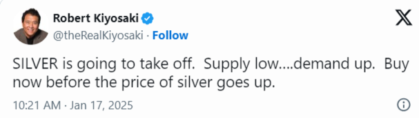 Finans gurusu attığı tweet’te gümüş fiyatının yükselmesini bekliyor. Bu bağlamda Kiyosaki, “Gümüş havalanacak. Arz düşük… talep yüksek.” Takipçilerini fiyat tavan yapmadan önce satın almaya başlamaya çağırdı. Finans uzmanı, “Gümüş fiyatı yükselmeden önce şimdi satın alın.”