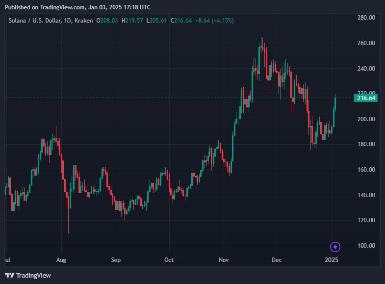 Solana, 2025 yılına güçlü bir başlangıç yaparak dikkatleri üzerine çekti. Coin, yazının hazırlandığı sırada 218 dolardan işlem görüyor. Son bir hafta içinde %18 oranında bir artış kaydetti. Ayrıca, Polymarket piyasa tahmin platformu, bu yıl içerisinde Solana ETF’sinin SEC tarafından onaylanma ihtimalinin %85 olduğunu öngördü.