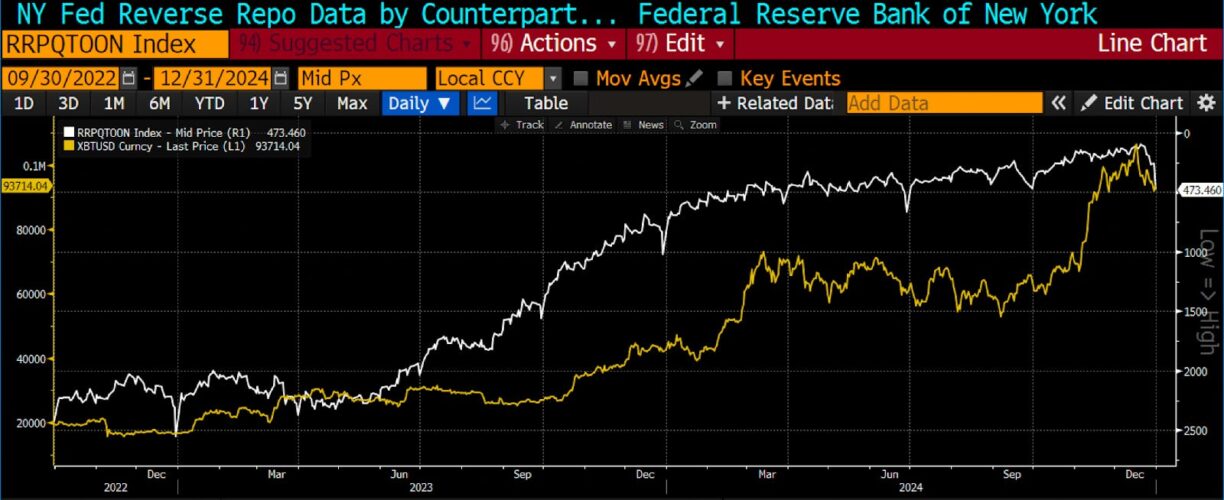 Fed’in Ters Repo Kolaylığı’nın (RRP) 2022’nin 3. çeyreğindeki zirvesine benzer şekilde, küresel likidite bir artış gördü. Ayrıca, BTC dibini buldu ve o zamandan beri yörüngesini tersine çevirdi. Hayes, Fed’in niceliksel sıkılaştırmaya (QT) 2025 ortasına kadar ayda 60 milyar dolar hızında devam edeceğini öngörüyor. Bu da finansal sistemdeki likiditeyi azaltacaktır. Bu durum, yakın zamanda alınan RRP oranlarını ayarlama kararıyla birlikte, likidite seviyelerinin 2025’in ilk çeyreğinde keskin bir şekilde düşmesine neden olacaktır.