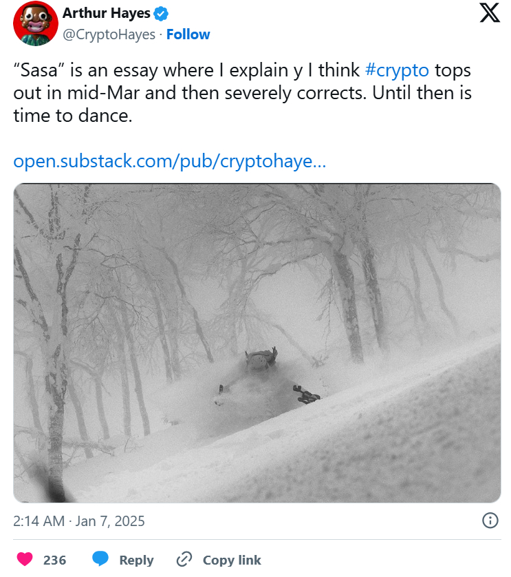 BitMEX kurucu ortağı Arthur Hayes, Bitcoin ve kripto paralar için 2025 ortasından önce zirve yapacağını ve bunu keskin bir düzeltmenin izleyeceğini öngörüyor. Hayes tahminini, Donald Trump’ın 1 Ocak’ta Beyaz Saray’da göreve başlamasıyla 2025’in 20. çeyreğinde ortaya çıkan ABD doları likidite ortamına dayandırdı.