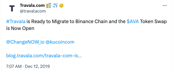 Kriptokoin.com’dan takip ettiğiniz üzere, 2017 yılında kurulan Travala, Blockchain teknolojisini uyguluyor. Bu alanda rezervasyon deneyimini iyileştiren büyük bir seyahat rezervasyon platformu. Başlangıçta AVA token’ıyla NEO Blockchain’de faaliyet gösterdi. Ancak Travala, platformunu 2019’un sonlarında Binance Chain’e taşıyacağını duyurdu.