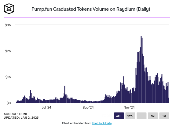 Kasım 2024’te zirve yapan Pump.fun platformunun aktivitesinde belirgin bir düşüş yaşanmakta. Raydium tokenlarının günlük hacmi de 19 Kasım 2.58 milyar dolar zirvesinden gerilemeye başladı. Aynı şekilde, Pump.fun’ın günlük gelirleri de 24 Kasım’da 5.31 milyon dolarla rekor seviyeye ulaştı. Bu esnada, 1 Ocak 2025’te bu rakam 2.12 milyon dolara düştü.