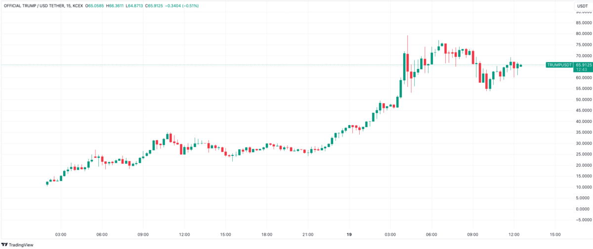 Donald Trump ile ilişkili OFFICIAL TRUMP (TRUMP) memecoin, son 24 saatte %130 artış gösterdi. Analistler, bu yükselişin 20 Ocak’ta gerçekleşecek yemin törenine kadar ikiye katlanabileceğini öne sürüyor.