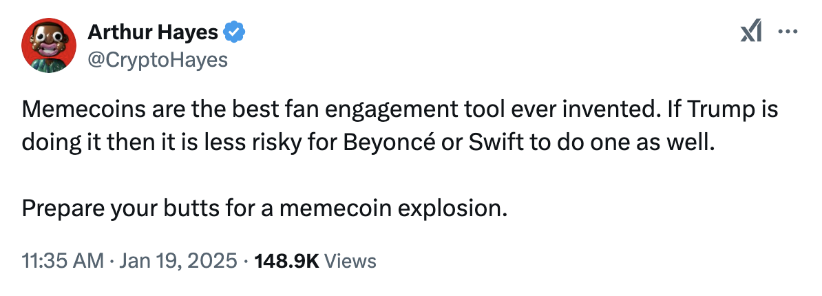 BitMEX’in kurucusu Arthur Hayes, memecoin topluluğunu harekete geçiren iddialı bir açıklamaya yer verdi. Hayes, 19 Ocak’ta TRUMP Token 60 dolar seviyesinde işlem gördüğü sırada şu açıklamayı yaptı: