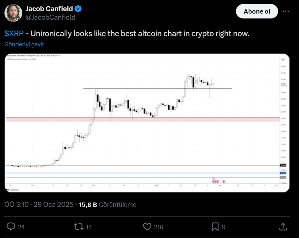 Kripto piyasasında dalgalanmalar devam ederken, deneyimli trader Jacob Canfield, XRP’nin şu an en iyi altcoin grafiğine sahip olduğunu söyledi. XRP fiyatı 2024’ten bu yana %500 artarak 3 dolar seviyesini aşarken, analistler büyük bir hareketin kapıda olabileceğini düşünüyor. Peki, XRP için sırada ne var?