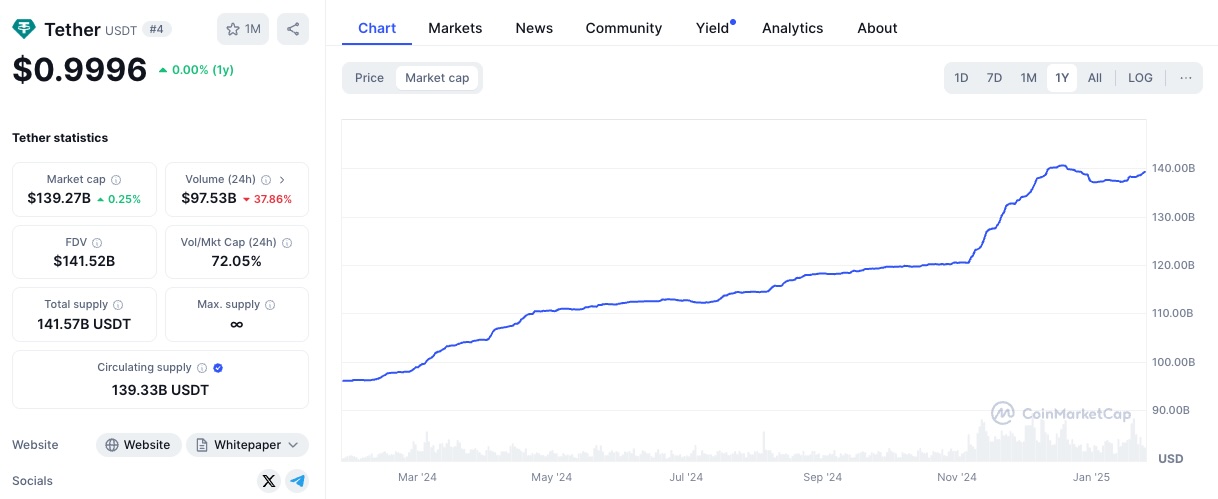 Circle’ın büyümesi, USDC’nin benimsenmesini artırmak için attığı adımlarla da destekleniyor. Son olarak, şirket Hashnote’un satın alınmasını tamamladı, bu da tokenize edilmiş gerçek dünya varlıkları (RWA) ihraç eden lider bir platforma sahip olmasını sağladı. Buna rağmen, USDC’nin piyasa değeri hâlâ USDT’nin %50’sinden daha az. Ayrıca, son bir yıl içinde USDC’nin piyasa değeri iki katına çıkarken, USDT de %50 büyüyerek 140 milyar dolarlık piyasa değerine ulaştı.