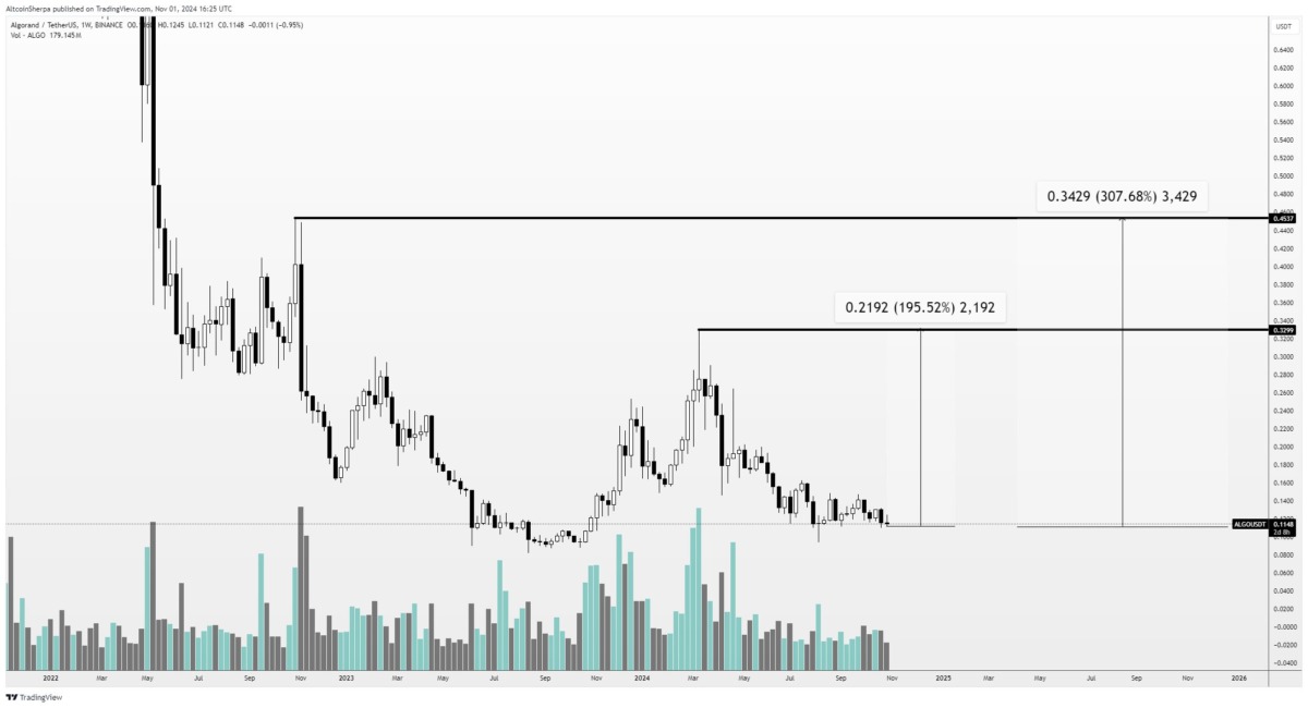 Kaynak: AltcoinSherpaGrafiğine göre analist, LINK’in ATH seviyelerini tekrar ziyaret edeceğini tahmin ediyor. Bu da LINK için %350’nin üzerinde bir artış anlamına geliyor. ALGO’ya gelince, Altcoin Sherpa, ATH seviyesi olan 3,56 doları işaret ediyor. Bu da token için %300’ün üzerinde bir hareket demek.