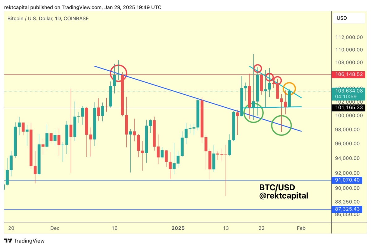 Rekt Capital, daha sonra lider kripto Bitcoin’in bir direnç bölgesini başarıyla yeniden test ettiğini söylüyor. Ancak bir kırılmayı doğrulamak için 106.000 dolar fiyatının üzerinde bir günlük kapanışa ihtiyaç duyduğunu belirtiyor. Bu doğrultuda analist, şu değerlendirmeyi paylaşıyor: