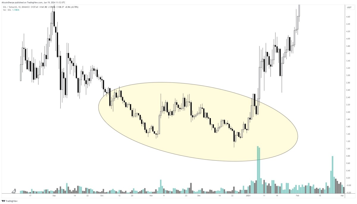 Analist ayrıca günümüz kripto piyasasının, Solana (SOL) da dahil olmak üzere alts’ın büyük ralliler yapmadan önce daha da gerilediği 2020’nin sonlarındaki kripto döngüsüyle karşılaştırılabilir olduğunu öne sürüyor. Bu bağlamda analist, şu değerlendirmesini paylaşıyor: