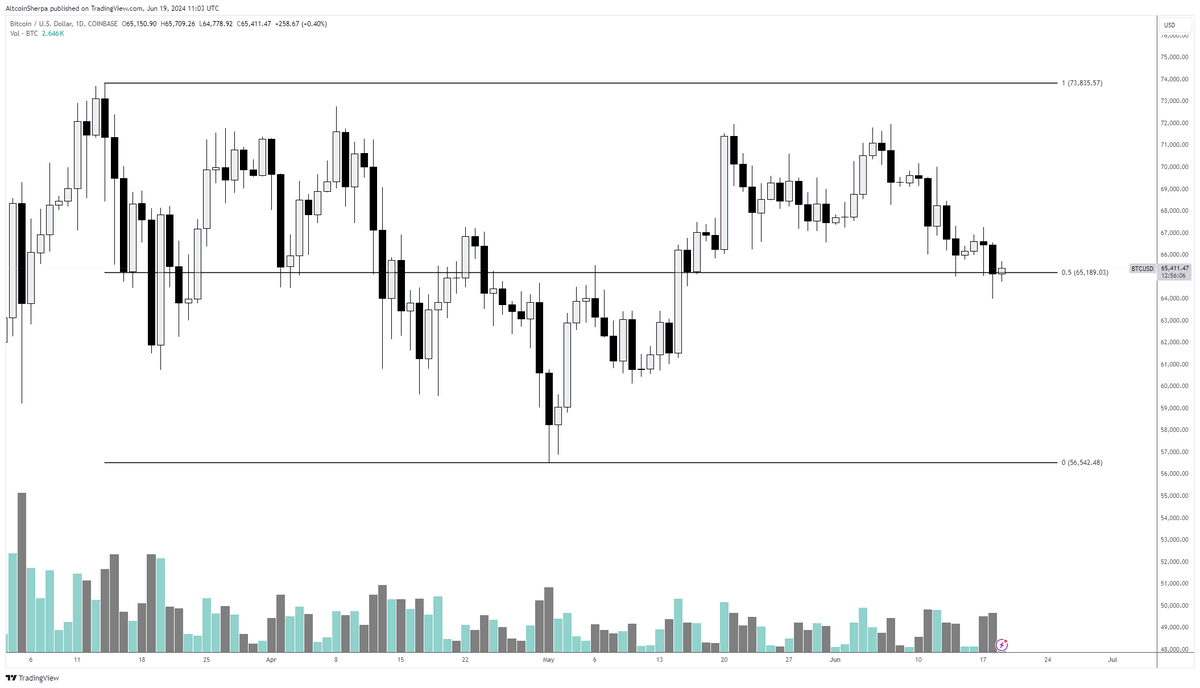Analist son olarak lider kripto para Bitcoin’i (BTC) ele alıyor. Altcoin Sherpa, günlük grafikteki fiyat hareketinin bir işlem aralığının ortasında seyrettiğini ve bir trend onayı beklediğini söylüyor. Bu doğrultuda analist, “BTC: Grafiklerinizi basit tutun ve rahatlayın. EQ (denge fiyatı) genellikle aktif olarak işlem yapmak isteyeceğiniz bir nokta değil. Ancak neler olacağını görelim.” diyor.