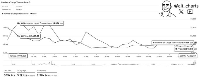Kripto analisti ayrıca son beş haftada Ethereum ağındaki balina aktivitesinin düştüğünü belirtiyor. Bu bağlamda analist, “25 Şubat’tan bu yana büyük Ethereum işlemlerinin sayısı %63,8 oranında azaldı ve bu da ağdaki balina aktivitesinde bir düşüşe işaret ediyor.” diyor.