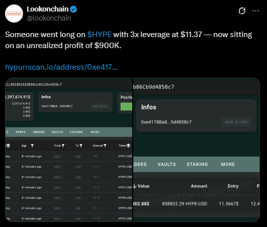 Lookonchain tarafından paylaşılan verilere göre, bu gizemli yatırımcı 3x kaldıraç kullanarak Hyperliquid altcoin için kalıcı vadeli işlem sözleşmesine giriş yaptı. Yatırımcı, HYPE altcoin fiyatı $11.36 seviyesindeyken 858.832 adet token’ı elinde bulunduruyordu.
