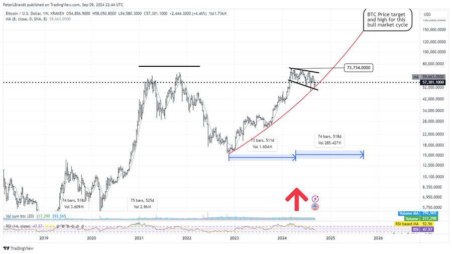 Peter Brandt, Bitcoin’in 2025 yılına kadar 150.000 dolara ulaşacağını öngördü. Brandt, bu fiyatın mevcut boğa piyasası döngüsünde Bitcoin’in en yüksek noktası olacağını belirten bir grafik paylaştı. Daha önce de benzer bir tahminde bulunan Brandt, geçmiş halving döngülerine dikkat çekti ve Bitcoin’in her halving olayından sonra 16 ila 18 ay içinde zirve yaptığını vurguladı.