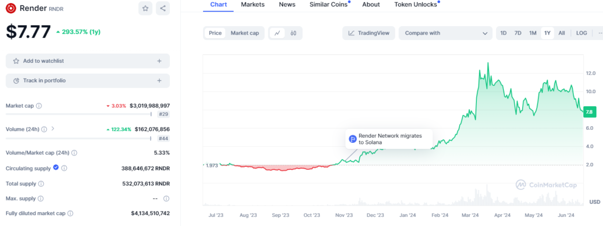 Render (RNDR), 5 milyar dolarlık piyasa değeri bariyerini aşmaya hazırlanan bir başka altcoin projesi. İçerik oluşturucular ve geliştiriciler için yenilikçi Blockchain tabanlı işleme hizmetleri sağlıyor. Nvidia’nın yapay zeka sektöründeki başarısı, RNDR gibi yapay zeka tokenlarına olan güveni artırarak önemli kazançlara yol açtı. Böylece, token son bir yılda yaklaşık %300 artış kaydetti. Render, büyük dijital içerik platformları ve merkezi olmayan uygulamalar (dApps) ile stratejik ortaklıklar kuruyor ve entegrasyonlar gerçekleştiriyor. Böylece, ekosistemini genişletmeye devam ediyor.