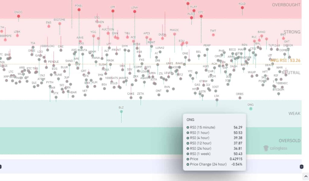 Kripto piyasası RSI ısı haritası, BLZ. Kaynak: CoinGlassİkinci sıradaki fırsat yaratan token: Ontology Gas (ONG)