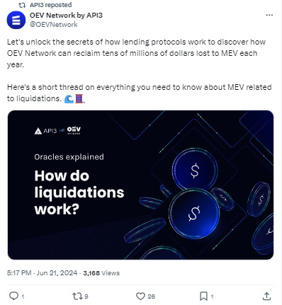 Şimdi, Chainlink’in yoğun bir şekilde biriktirildiğini gördük. Bunun nedeni önde gelen bir altyapı projesi olması. Ancak bu sektörde oracle’ların radarından kaçan bir proje varsa o da API3. Şu anda neredeyse 50 Blockchain üzerinde aktif durumda. Dolayısıyla, bu proje için bir birikim görebiliriz. API3 ile geliştiriciler bir akıllı sözleşmeye doğrudan bir dAPI ekleyebilir. API, bir Uygulama Programlama Arayüzüdür. Yazılım uygulamalarının birbirleriyle konuşmasını sağlar. Bir dAPI aynıdır, ancak merkezi değildir. API3 bunları veri akışları için kullanır. API3 ayrıca OEV ağını da tanıtmak üzere. Bu, Oracle’ın çıkarılabilir değeridir. Bu, aksi takdirde diğer taraflara gidecek olan değeri çıkarabilir. Örneğin, arbitraj veya tasfiye yoluyla. Bu, protokolleri teşvik edebilir.