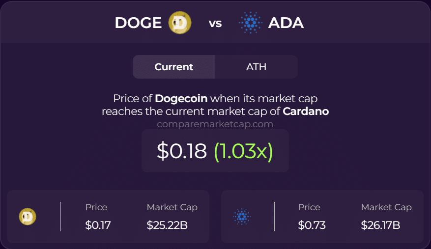 Şu anda DOGE’nin piyasa değeri 25,22 milyar dolar. ADA ise 26,17 milyar dolar seviyesinde. DOGE, ADA’yı geçmek için fiyatını yaklaşık 1,03 kat artırmalı. Bu da 0,19 dolara işaret ediyor.