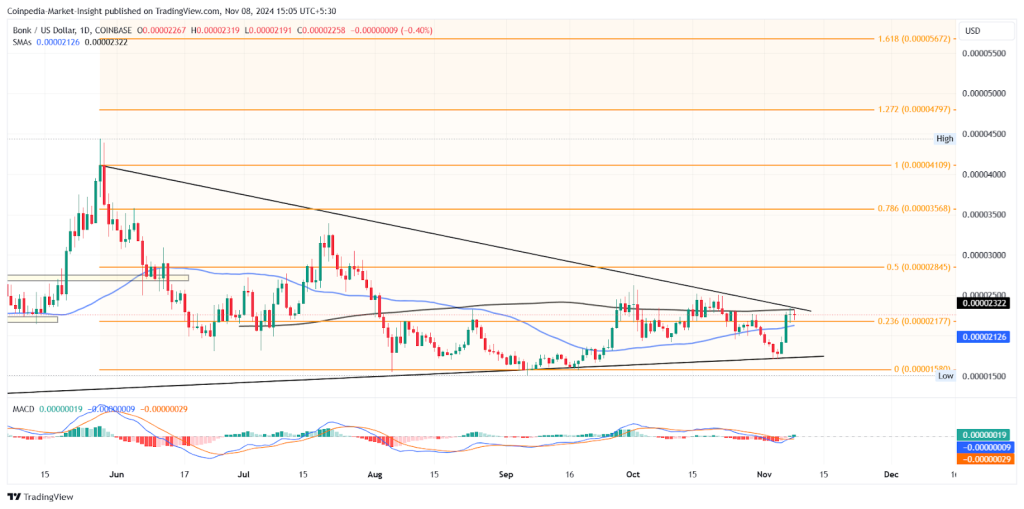 BONK, uzun süredir devam eden bir üçgen formasyonunun direnç trend çizgisine meydan okuyor. Böyle bir boğa döngüsüyle meme coin, bir koparma rallisinin eşiğinde duruyor. BONK 50 günlük EMA’yı aştı. Ayrıca, şimdi 200 günlük üstel hareketli ortalama dinamik direnci test ediyor. Son 4 günde yaklaşık %28 artış gösterdi. Böylece, V şeklinde bir toparlanma görüyor. Fibonacci’nin %23,60 seviyesini 0,0000217 dolar ile aşarak 0,000020 dolar psikolojik sınırını aştı. Yutan iki büyük boğa mumuyla, şu anda bir akşam yıldızı formasyonuyla %23,60 seviyesindeki kırılmayı yeniden test ediyor. Test sonrası bir geri dönüş muhtemelen direnç trend çizgisini aşacak ve 0,00002845 dolardan %50 seviyesine ulaşacaktır.