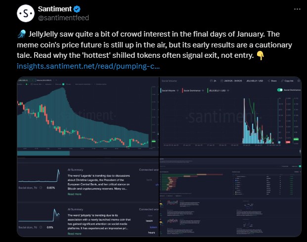 Venmo kurucusu sadece birkaç gün önce yatırımcılar arasında anında hit olan JellyJelly tokenini piyasaya sürdü. Bununla birlikte, yakın tarihli bir Santiment raporu, tokenin ‘pump and dump’ olasılığını speküle etmeden önce birincil temellerden veya gelişmelerden yoksun olduğunu tespit etti. Dahası, JellyJelly fiyatı grafiklerde sürekli düşüş göstererek sorunlu ve satılması gereken bir kripto haline geldi.