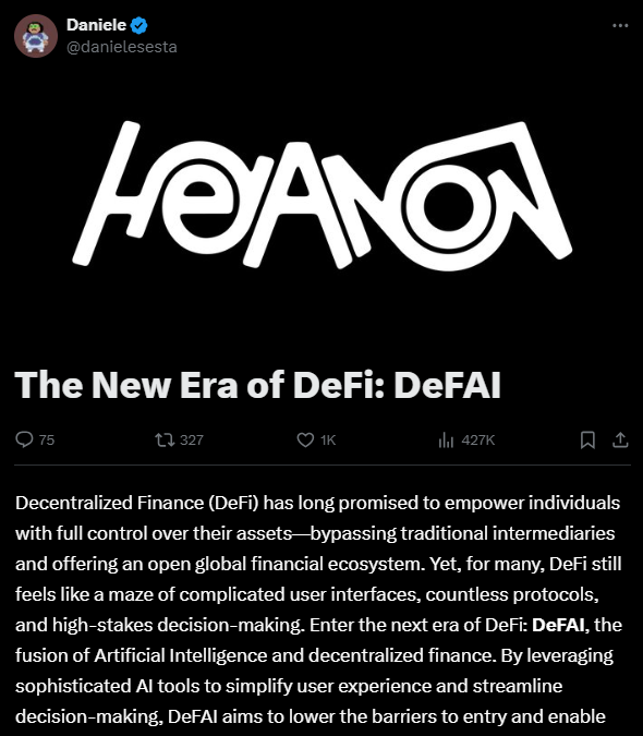 DeFAI, DeFi’nin genelde karmaşık olan kullanıcı deneyimini kökten değiştirmek için yapay zekayı devreye sokuyor. Önde gelen bir DeFAI savunucusu olan Daniele, bu teknolojinin üç önemli yenilik sunduğunu belirtiyor: