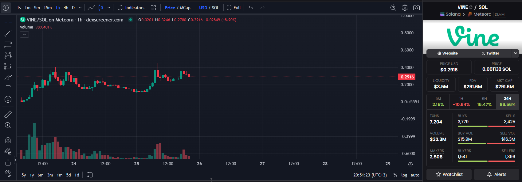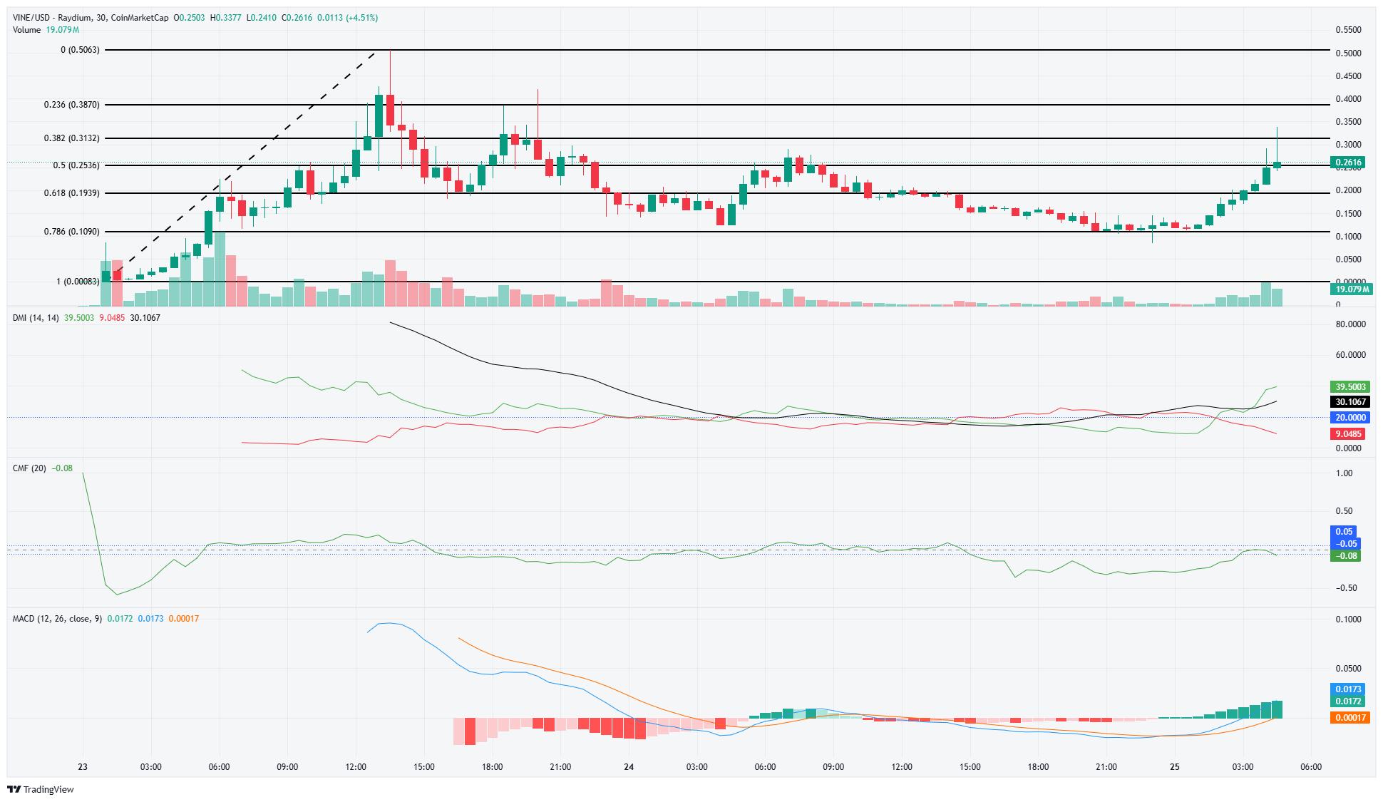 VINE’in 30 dakikalık fiyat grafiği, boğaların yeniden hakimiyet kurduğunu ortaya koyuyor. Perşembe günü 0.506 dolara yükselen fiyat, daha sonra 0.109 dolara kadar geriledi. Ancak son 6 saat içinde güçlü bir toparlanma gösterdi.