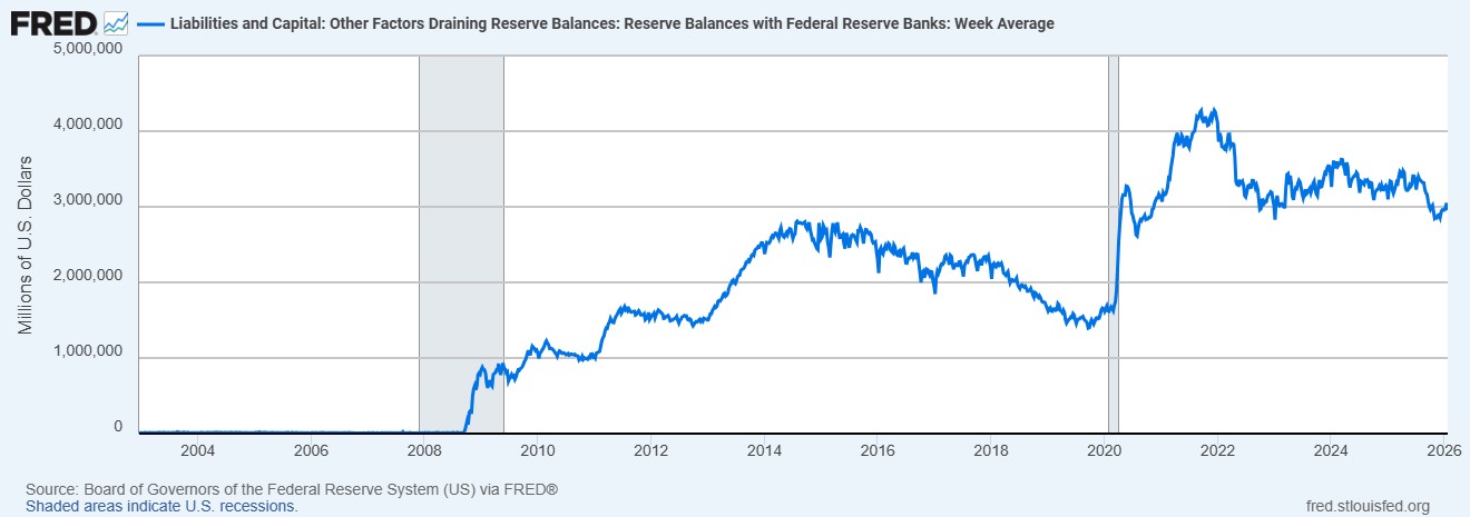 Bu grafik, Fed’in politika duruşunu yalnızca manşet faizle değil, rezervlere ödediği faiz (IORB) üzerinden de yönettiğini göstermektedir. Fed, 2026’ya girerken para koşullarını ayarlamada likidite kanallarını daha aktif kullanmaktadır.